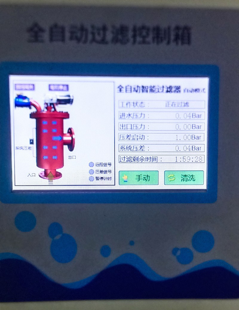 自動控制:自動控制有定時和壓差兩個方式。在過濾時間定時器上設定過濾時間,當過濾時間到,啟動排污,排污時間由排污時間定時器設定;同時控制系統(tǒng)實時將系統(tǒng)壓差與用戶設定的壓差相比較,當系統(tǒng)壓差達到設定壓差時,過濾器也進行清洗排污,排污時間由排污時間定時器設定。排污時間到,停止清洗,系統(tǒng)恢復至其初始狀態(tài),為下一個過濾工序作好準備。